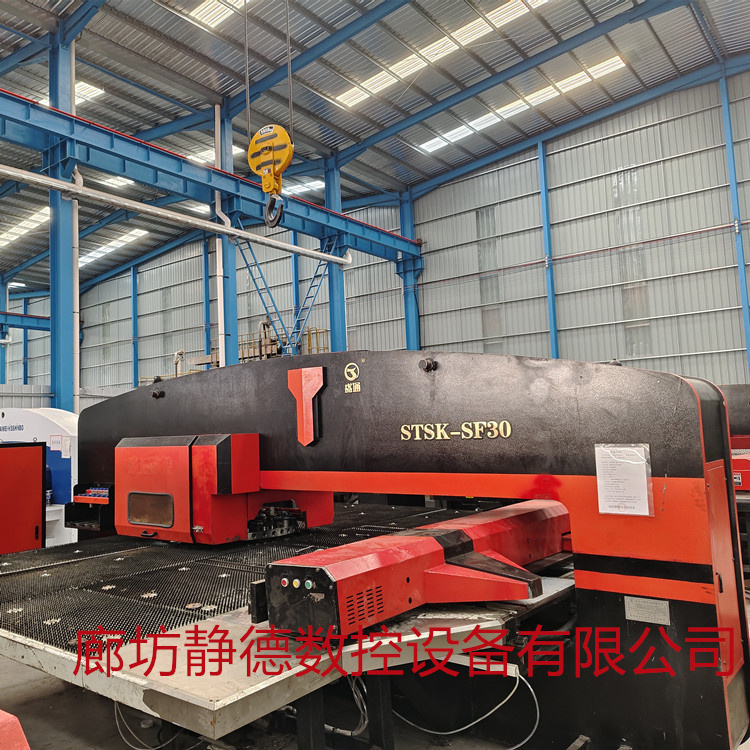 出售转让_高性价比_精品二手青岛盛通全电伺服数控转塔冲床STSK-SF30、数控冲床,冲压能力:30吨,32工位,2旋转工位,加工尺寸:1250×5000mm,2019年12月份出厂,成色:9.9成新,该机为全电伺服式冲床,速度快,节能环保,预购从速!本机也可以加工滚筋,百叶窗,拉包,单双桥等特殊工艺。每台设备到店都要进行30多项检测,检修,各项功能、性能达到新机精度方可出售。该机已调试完毕,可现场试机,现场绘图,现场打板,现场尺测精度,保证正负十丝以内的新机精度。所售设备包安装、调试、培训,保修三个月,免费赠送编程软件,终身免费维护,24小时技术支持,终身配件供应,机会难得,预购从速。 廊坊静德数控设备有限公司 销售顾问:田永强13785632893可加微信