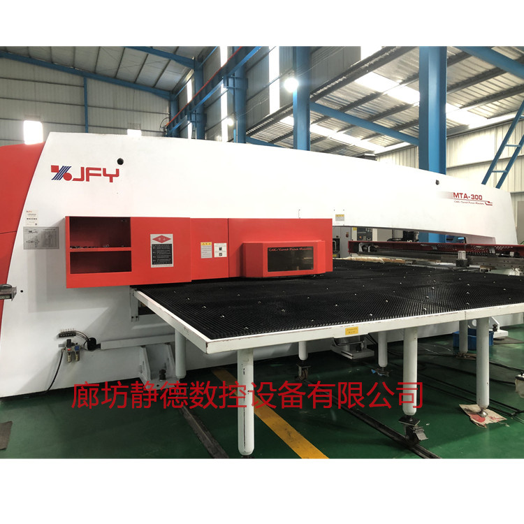 出售转让_高性价比_精品二手江苏金方圆MTA300E全电伺服式数控转塔冲床 数控冲床 金方圆产,德国倍福数控系统,冲压能力:30吨,32工位,2旋转工位, 加工尺寸:2000*5000MM,超宽超大板面,2023年3月份出厂 ,全新设备!该机为全电伺服式冲床,更快,更省电,可以进行滚筋,打标,刻字等特殊工艺加工!每台设备到店都要进行30多项检测,各项功能性能达到新机精度方可出售!设备已调试完毕,可现场试机,现场打板,现场尺测精度,保证设备正负十丝以内的新机精度。所售设备我公司免费安装、调试、培训员工、保修三个月。 廊坊静德数控设备有限公司 销售顾问:田永强13785632893可加微信
