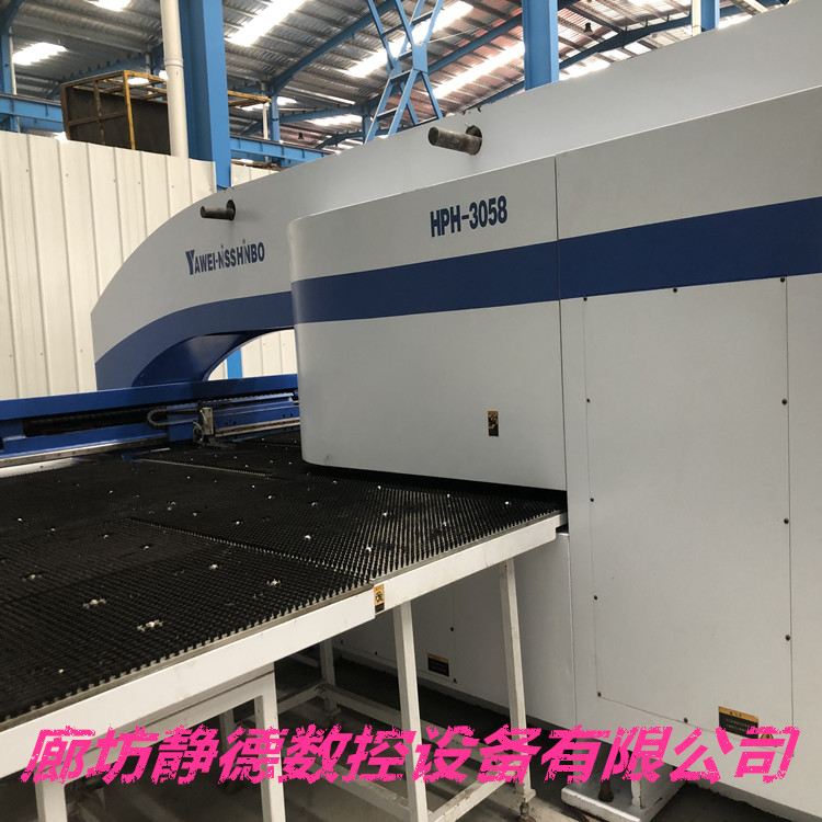 出售转让_高性价比_精品二手江苏亚威 数控转塔冲床 数控冲床 型号:HPH3058,冲压能力:30吨,油压式,德国西门子数控系统,36工位,2旋转工位, 加工尺寸:1500*5000MM,2013年10月产 ,9.5成新新,本机采用日本日清纺转塔,台湾丝杠导轨,标准件全部日本进口,性能更稳定。该设备已调试完毕,保证精度,可现场试机!每台设备到店都要进行30多项检测,各项功能性能达到新机精度方可销售!所售设备 免费安装、调试、培训,保修三个月,24小时技术支持,赠送编程软件,终身配件供应,机会难得,预购从速。廊坊静德数控设备有限公司 联系人:田永强 13785632893可加微信。