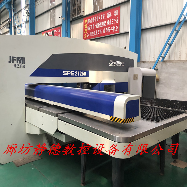 出售转让_高性价比_精品二手济南捷迈全电伺服数控转塔冲床、数控冲床SPE21250,30吨公称压力,该机配备日本发那科数控系统,32工位,2旋转工位, 加工尺寸:1250*5000MM,2014年12月产 ,9.5成新,厚转塔刚性好,抗偏载,模具寿命长;进口直线导轨和大导程滚珠丝杆,高速平稳,气动全浮动夹钳减少板材变型送料更稳,全电伺服式,响应快,噪音低,能耗小,高速打点:最大约2000次/min,设备到店以后都要进行30多项检测,可冲孔、切边、百叶窗、浅拉伸、步冲成型等工艺,各项功能性能达到新机精度方可出售!该机已调试完毕,保证精度,可现场试机,我公司免费安装、调试、培训,保修三个月,24小时技术支持,终身配件供应,免费赠送编程软件,终身免费维护,机会难得,预购从速。廊坊静德数控设备有限公司 联系人:田永强13785632893可加微信。