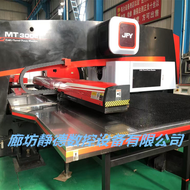 出售转让_高性价比_精品二手江苏金方圆MT300E全电伺服式数控转塔冲床 数控冲床 金方圆产,全电伺服冲,冲压能力:30吨,32个工位,2个旋转工位,加工尺寸:1250*5000MM大板面,2016年4月出厂 ,成色:9.5成新,该机为全电伺服式冲床,速度更快,更省电,可以进行滚筋,打标,刻字等特殊工艺加工!设备已调试完毕,可现场试机,现场打板,现场尺测精度,保证设备正负十丝以内的新机精度。所售设备我公司免费安装、调试、培训员工、保修三个月。 廊坊静德数控设备有限公司 销售顾问:田永强13785632893可加微信。