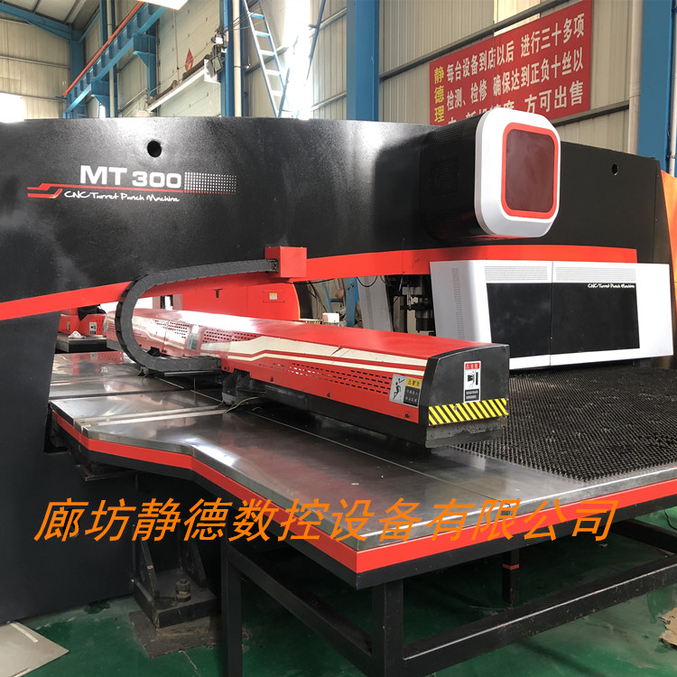 出售转让_高性价比_精品二手江苏金方圆MT300E全电伺服式数控转塔冲床 数控冲床 金方圆产,型号:MT300E,德国倍福数控系统,冲压能力:30吨,32工位,2旋转工位, 伺服式,加工尺寸:1500*5000MM,大板面,2014年4月份出厂 ,9成新!该机为全电伺服式冲床,更快,更省电,可以进行滚筋,打标,刻字等特殊工艺加工!每台设备到店都要进行30多项检测,各项功能性能达到新机精度方可出售!设备已调试完毕,可现场试机,现场打板,现场尺测精度,保证设备正负十丝以内的新机精度。所售设备我公司免费安装、调试、培训员工、保修三个月。 廊坊静德数控设备有限公司 销售顾问:田永强13785632893可加微信。