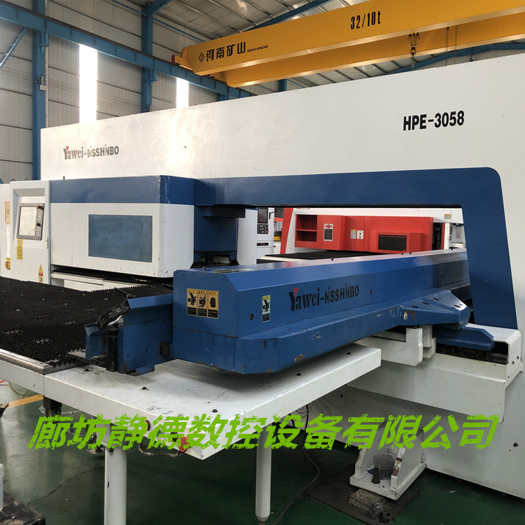 出售转让_高性价比_精品二手江苏亚威HPE3058全电伺服式数控转塔冲床、数控冲床,冲压能力:30吨,德国西门子数控系统,40工位,2个旋转工位, 加工尺寸:1500*5000MM,2017年11月份出厂,9.9成新,每分钟冲次1800次,速度快,该机采用亚威新式床身,机身重达18吨,冲压更稳定,可进行滚筋,滚切,打标,刻字,百叶窗,拉包,单双桥等特殊工艺加工。购入后使用不多,全电伺服式,节能高效,环保,速度快!每台设备到店都要进行30多项检测,各项功能性能达到新机精度方可销售!设备已调试完毕,可现场试机!现场绘图,现场打板,现场尺测精度,保证正负十丝以内的新机精度!所售设备 免费安装、调试、培训,保修三个月。廊坊静德数控设备有限公司 销售顾问:田永强 13785632893可加微信。